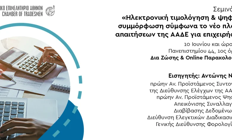 Σήμερα στις 17:00 σεμινάριο Ε.Ε.Α.: «Ηλεκτρονική τιμολόγηση & ψηφιακή συμμόρφωση σύμφωνα το νέο πλαίσιο απαιτήσεων της ΑΑΔΕ για επιχειρήσεις»
